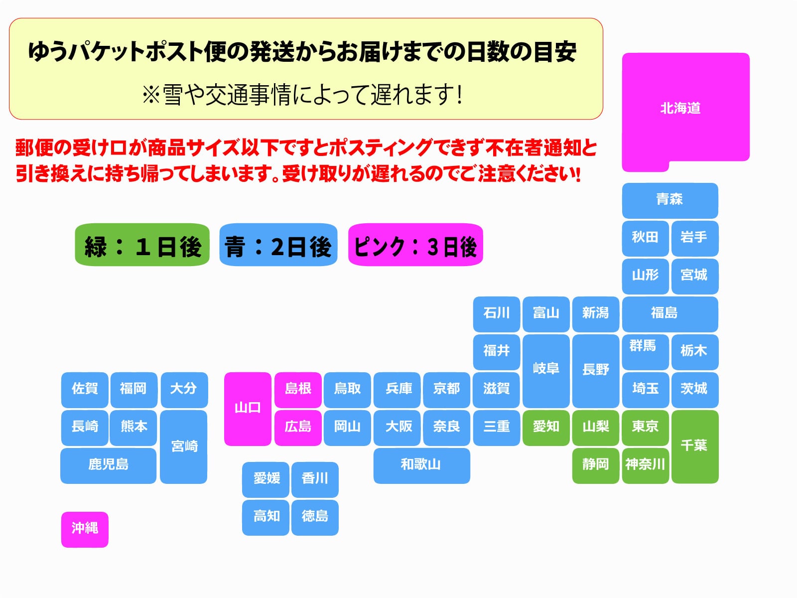 ※郵便受け口が商品より小さいと届けられず[不在連絡票]が代わりに届きます。